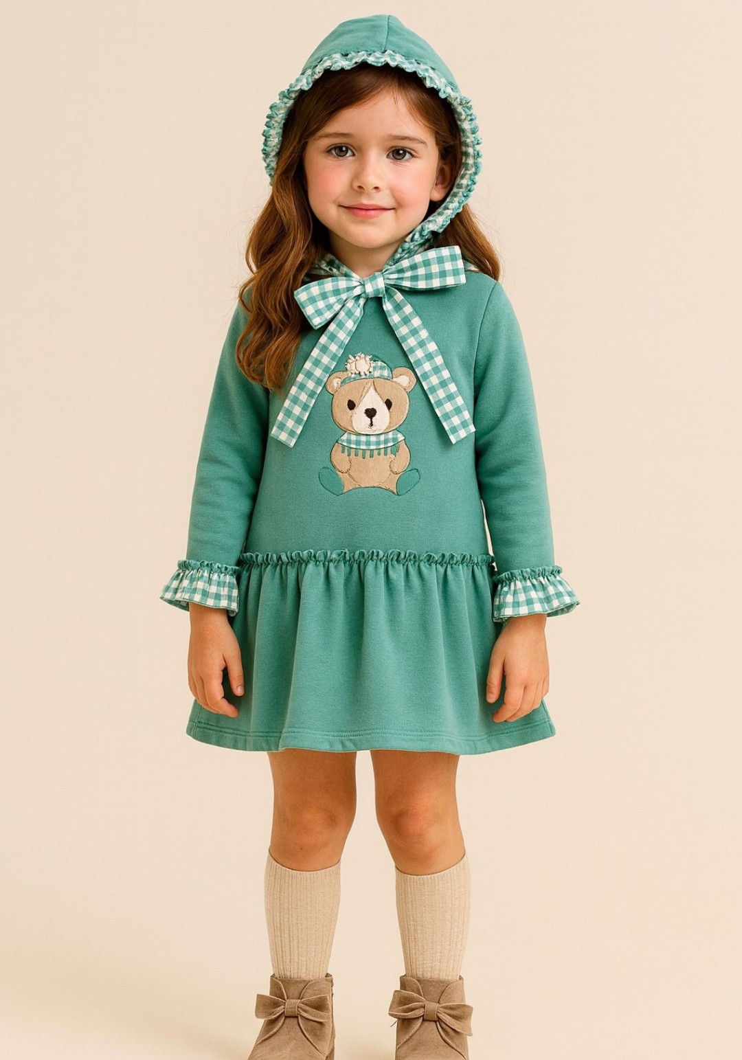 **Ternura y estilo en un solo vestido.** Diseño exclusivo con capucha acolchada, lazada de cuadros vichy y adorable ilustración de osito.
